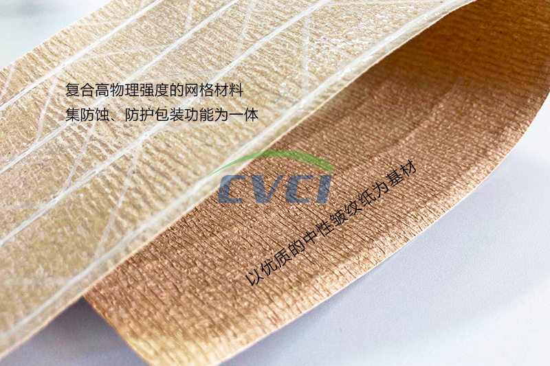 加網(wǎng)復合紙以優(yōu)質(zhì)的中性皺紋紙為基材,按結(jié)構(gòu)和特性分為皺紋加網(wǎng)復合紙和阻隔型皺紋加網(wǎng)復合紙。產(chǎn)品可添加氣相緩蝕劑,制作成加網(wǎng)型復合氣相防銹紙。